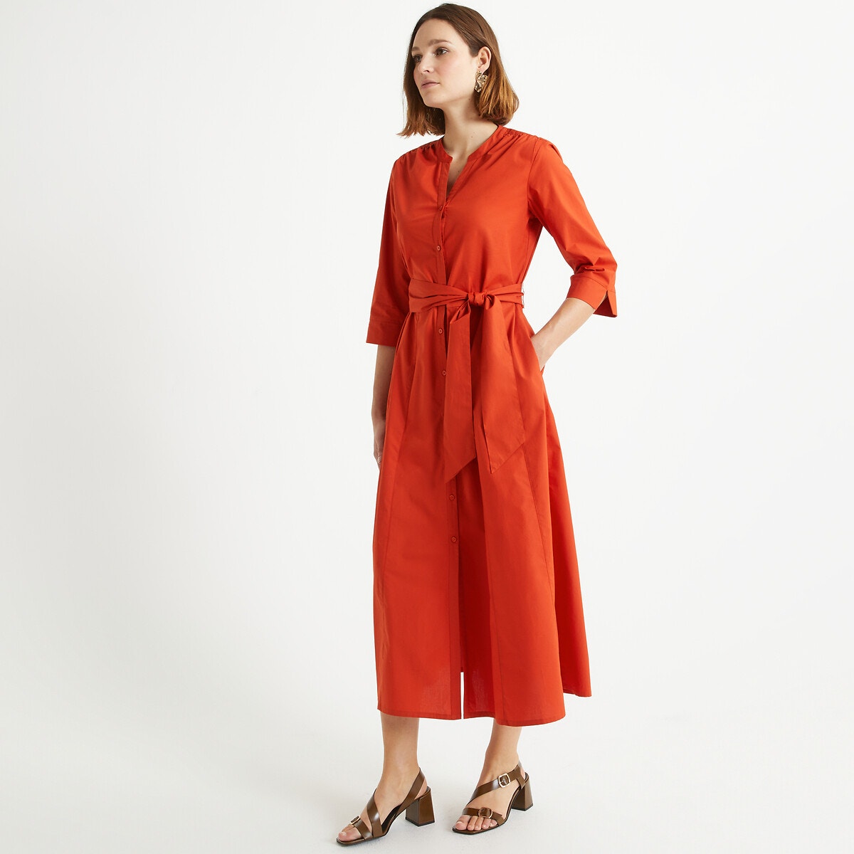 Το φόρεμα του καλοκαιριού… Σε ζωηρό, λαμπερό χρώμα, ιδανικό για αυτή τη σεζόν! Λαιμόκοψη κελεμπίας. Μανίκια 3/4 με μικρό σκίσιμο. Λοξές τσέπες. Ζώνη που δένει.Περιγραφή – Εβαζέ γραμμή – Μίντι μήκος – Μανίκια 3/4 – Λαιμόκοψη με κουμπιάΔιαστάσεις για το μέγεθος 38/M – Μήκος: 130 εκ. – Μήκος μανικιών: 42 εκ. Σύνθεση και συντήρηση: – 100% βαμβάκι – Για τις οδηγίες συντήρησης, δείτε την ετικέτα του προϊόντος.- Ετικέτα OEKO-TEX® Standard 100. Η πιστοποίηση OEKO-TEX® Standard 100 είναι μια ανεξάρτητη και διεθνής πιστοποίηση που εγγυάται την απουσία επιβλαβών ή ερεθιστικών ουσιών για το δέρμα και προστατεύει την υγεία των καταναλωτών.